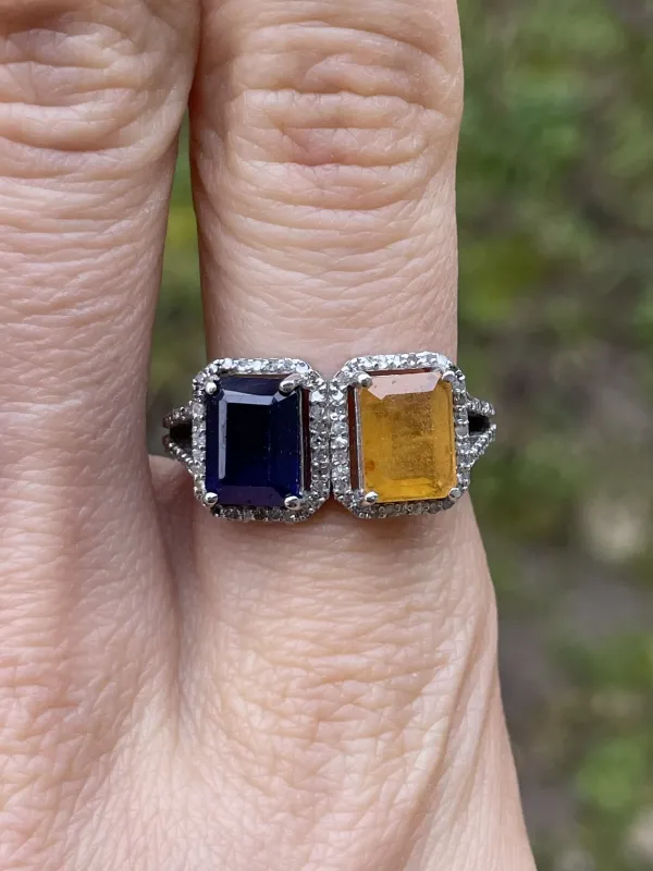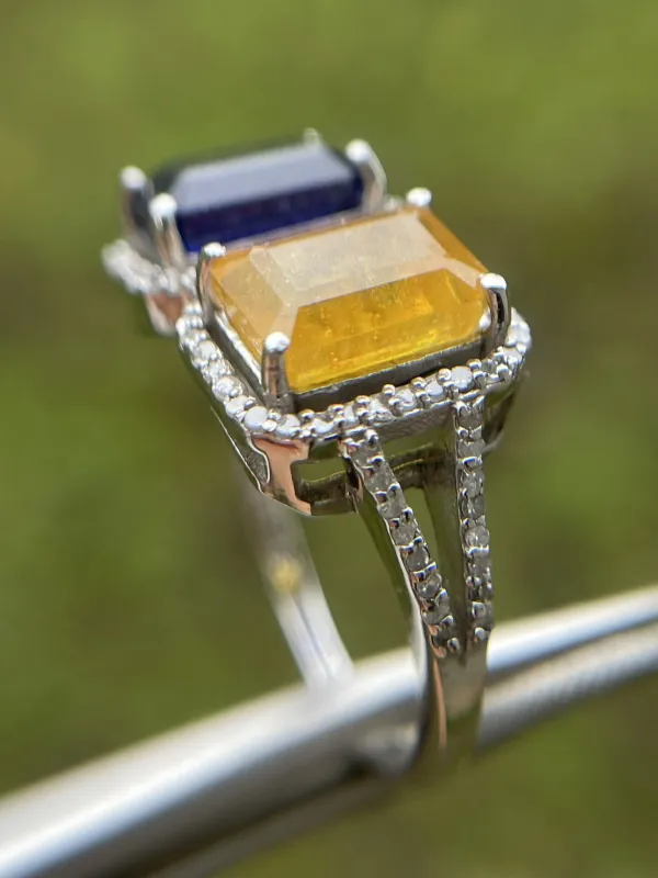 Сапфирите в жълт и син цвят излъчват мъдрост, яснота и радостна енергия, а кръглите диаманти добавят фин блясък и изискан акцент, който подчертава богатството и дълбочината на камъните. Комбинацията създава усещане за хармония, елегантност и изразителен стил. Изработен от сребро 925, пръстенът има впечатляващо и елегантно присъствие – бижу със силна символика, финес и осезаем чар!